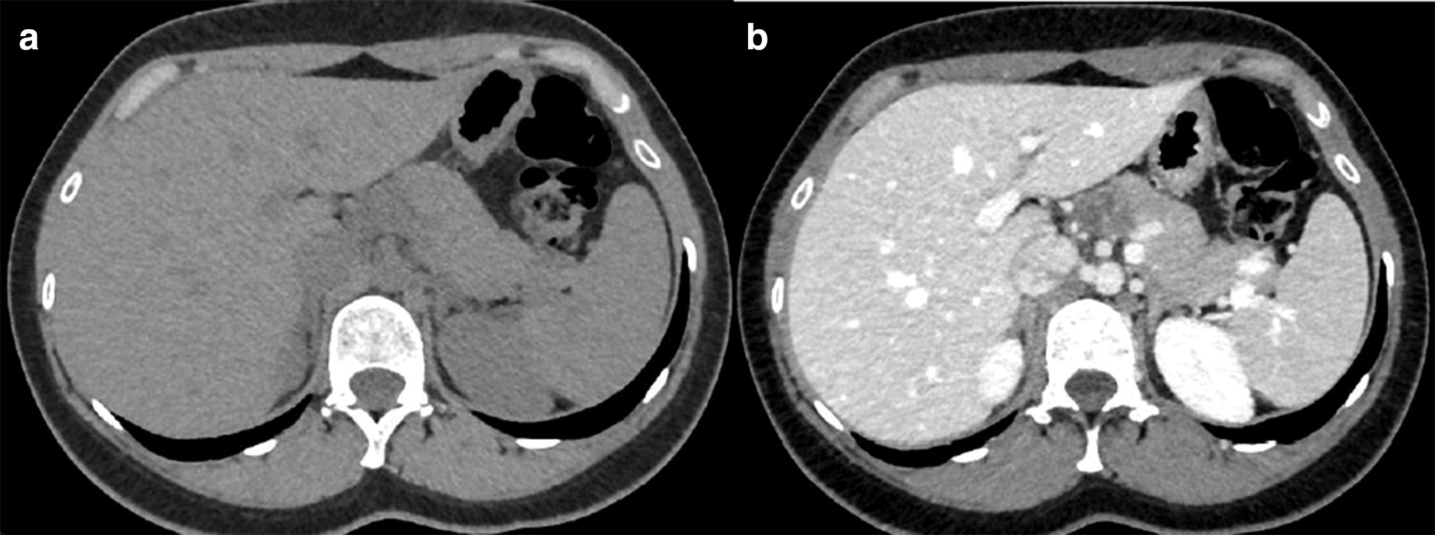A 33-year-old woman presented at the outpatient clinic complaining of vague upper abdominal pain for the previous two years.