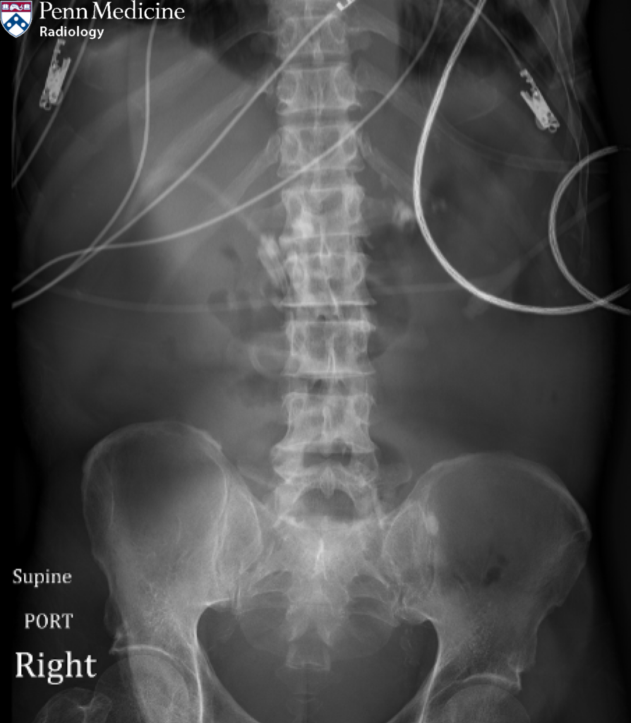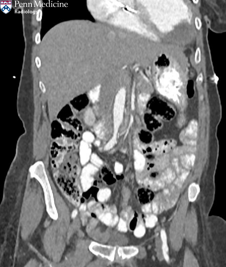 A 62-year-old woman with abdominal pain, vomiting, and occasional diarrhea.