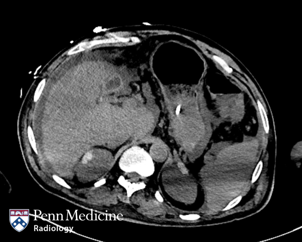 A 38-year-old woman with hypertension, abdominal distension, and a history of chronic kidney disease.