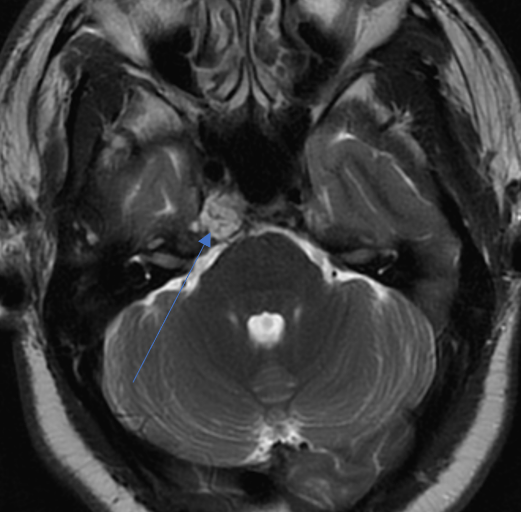 A 29-year-old male with headaches, right eye pain, decreased sensation in right V1 distribution, and right CN VI palsy.