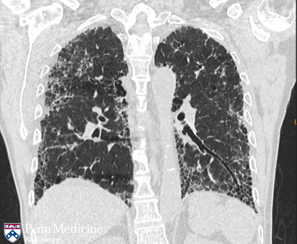 A 62-year-old woman with chronic shortness of breath and cough.