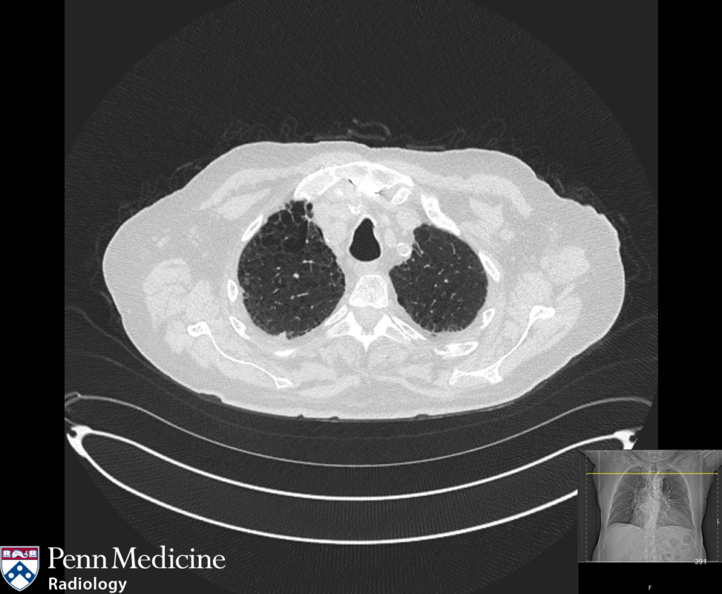 A 68-year-old woman with dyspnea and a history of tobacco use.