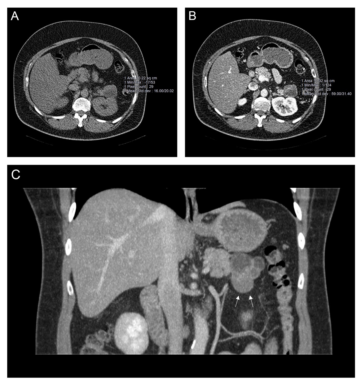 A 47-year-old man with a six-month history of abdominal discomfort.