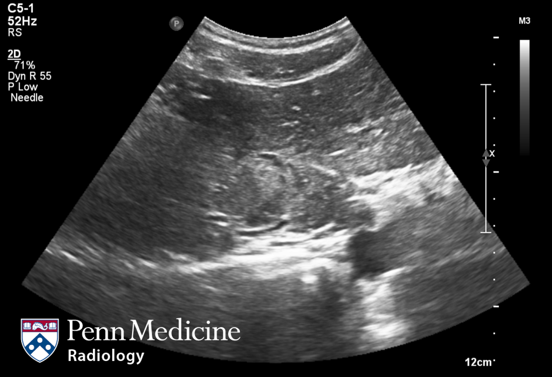 Lesson 1 of 0 In Progress Ultrasound image Ultrasound-guided biopsy was performed. Ultrasound revealed that the lesion had hyperechoic, isoechoic, and hypoechoic parts relative to the surrounding liver. Pathologic diagnosis: angiomyolipoma